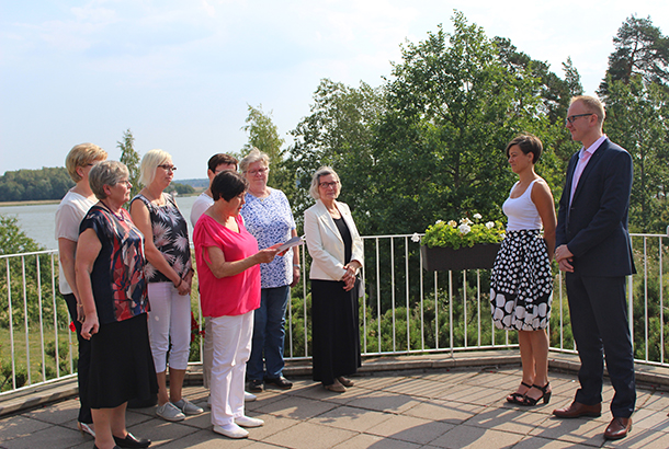 Naisleijonat myönsivät rahalahjoituksen Lounais-Suomen Syöpäyhdistykselle Meri-Karinassa perjantaina 24. elokuuta. Lahjoituksen vastaanottivat projektipäällikkö Salakari ja yhdistyksen toimitusjohtaja Ville Viitanen.